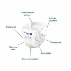 Bambo Nature -vaipan pehmeä ja vaatteenomainen pinta on hellä vauvasi herkkää ihoa vasten ja takapaneeli on tekstiilinkaltaista hengittävää materiaalia. Bambo -vauvanvaipat ovat dermatologisesti testattuja ja allergiaystävällisiä. Vaipat on valmistettu ilman parabeeneja, kloorivalkaisua tai hajusteita, joten ne ovat turvallisia, helliä ja ihanan pehmoisia vastasyntyneen vauvan iholle ja sopivat myös keskosille. Ihoystävällisten vaippojen avulla myös vaippaihottuma pysyy aisoissa. Lapsilähtöiset Bambo Nature -vaipat on suunniteltu sopivaksi lapsen tarpeisiin, sekä mahdollisimman mukavaksi vauvasi päälle. Vaippojen joustava vyötärö ja jalantiet mahdollistavat tehokkaan suojan ohivuotoja vastaan, mutta myös täyden liikkumavapauden pikkuisellesi. Jousto antaa vauvasi liikutella jalkojaan vapaasti, ilman ärsyttävää kireyttä.