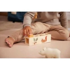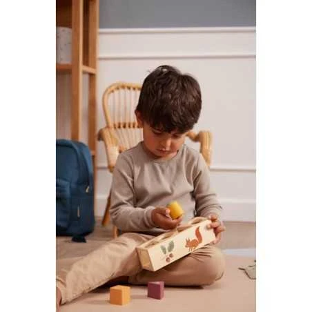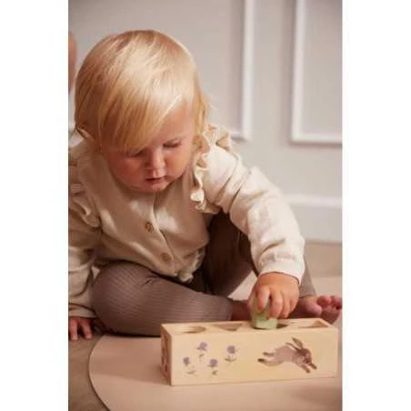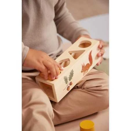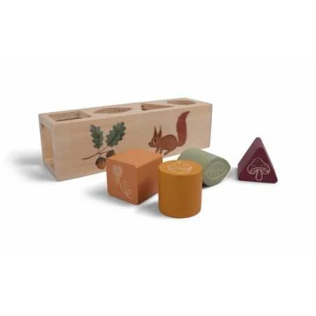Puinen palikkalaatikko on koristeltu kauniilla kuvilla ja siinä on 4 eri mallista reikää. Palikkalaatikolla pelaaminen kehittää lapsen hienomotorisia taitoja, silmäkäsikoordinaatiota, sekä ongelman ratkaisukykyjä, kun hän yrittää selvittää minkä mallinen puupalikka mahtuu mistäkin aukosta sisään laatikkoon. 4 puupalikassa on kauniit, murretut sävyt sekä koristeena erilaisia kasvillisuuksia, kuten sieni tai lehti.