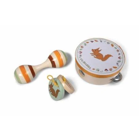 - 3 lelusoitinta: Tamburiini, marakassi, ja kastanjetit