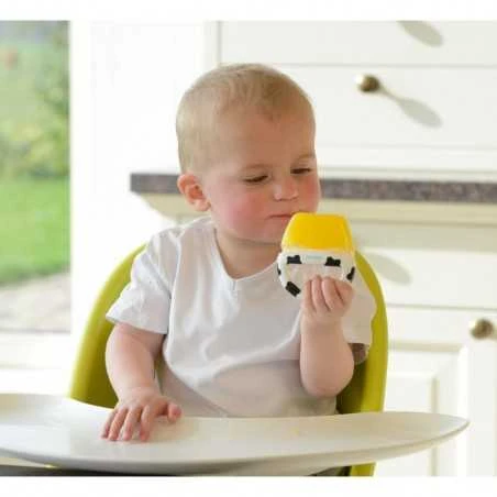 Kiva purulelu, joka on turvallinen pureskeltava lapselle kun ikenet kutiavat. Lisäksi purulelusta saa tehtyä kivan viilentävän mehujään täyttämällä suojakupin mehulla tai maidolla ja laittamalla purulelun pakastimeen.