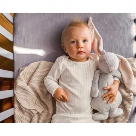 Moonie unipupun käpälät on täytetty rakeella, joka stimuloi vauvan tuntoaistia. Myös pehmeät korvat kutsuvat pieniä sormia, ja tuovat lohtua sekä turvaa lapselle. Solmimalla korvat, voi pupun ripustaa esimerkiksi pinnasängyn laitaan roikkumaan.