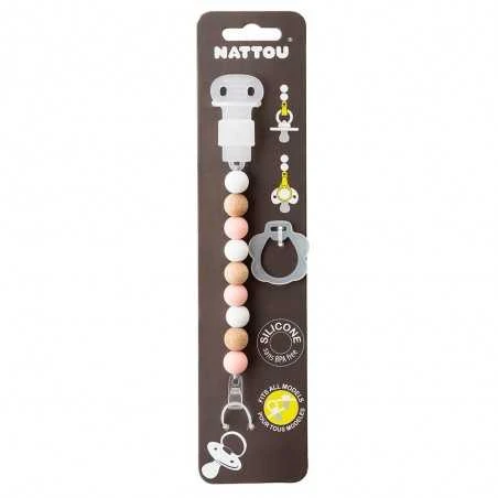 Sievä tuttiketju, joka koostuu silikonihelmistä. Nattou tuttinauha on helppo kiinnittää lapsen vaatteisiin, ja nauhan toiseen päähän saa kiinnitettyä niin renkaalla kuin nupilla varustetun tutin. Tuttiketjun avulla lapsen tutti pysyy aina tallessa, eikä pääse tipahtamaan lattialle tai maahan.