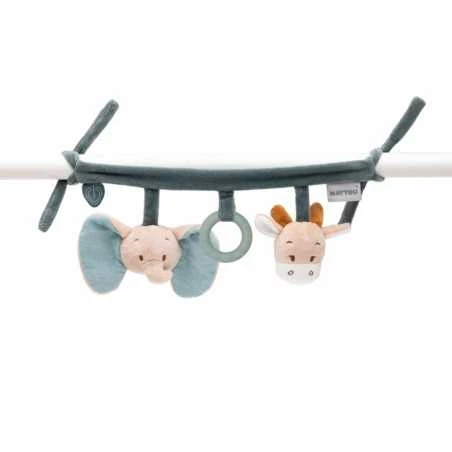 Nattou pehmeä vaunulelu tuo iloa ja viihdykettä niin kotona kuin matkoilla. Voit kiinnittää sen nopeasti ja helposti esimerkiksi pinnasängyn reunaan, turvakaukalon kantokahvaan ja vaunukopan kuomuun. Pehmeät eläinhahmot elefantin ja kirahvin muodossa sekä silikonirinkula auttavat lasta kehittämään motorisia taitoja. Vaunulelussa on myös helistin ja rapiseva ääni.