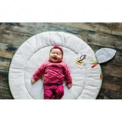 Leikkimatto on muhkea ja pehmeä, joten vauvan on siinä kiva köllötellä selällään ja mahallaan. Matto on pyöreänmallinen ja kiinnitetään puisiin kaariin neljällä kiinnitysremmillä.